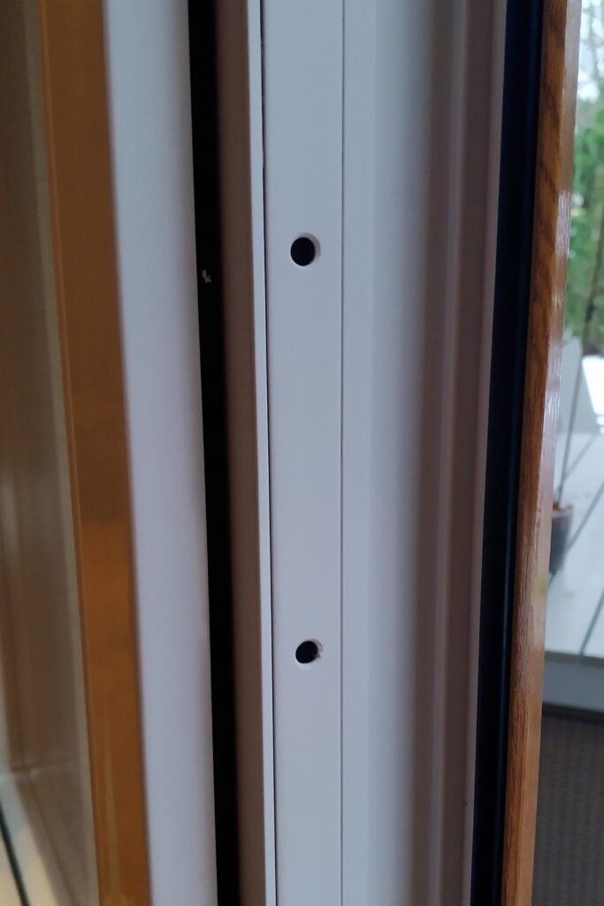 On the fixed stile there were no predrilled holes. To find the correct height for the holes I installed the bracket mirrored and put the magnetic catch on it. This gave me enough space to indicate the right height of the magnetic catch from the outside. To find the correct position of the holes I held the magnetic catch at the correct height with the magnet flush to the inside of the stile and transferred the correct position thru the mounting holes of the catch. I drilled the holes with a drill corresponding to the diameter of the seize of the mounting notches on the back side of the catch.