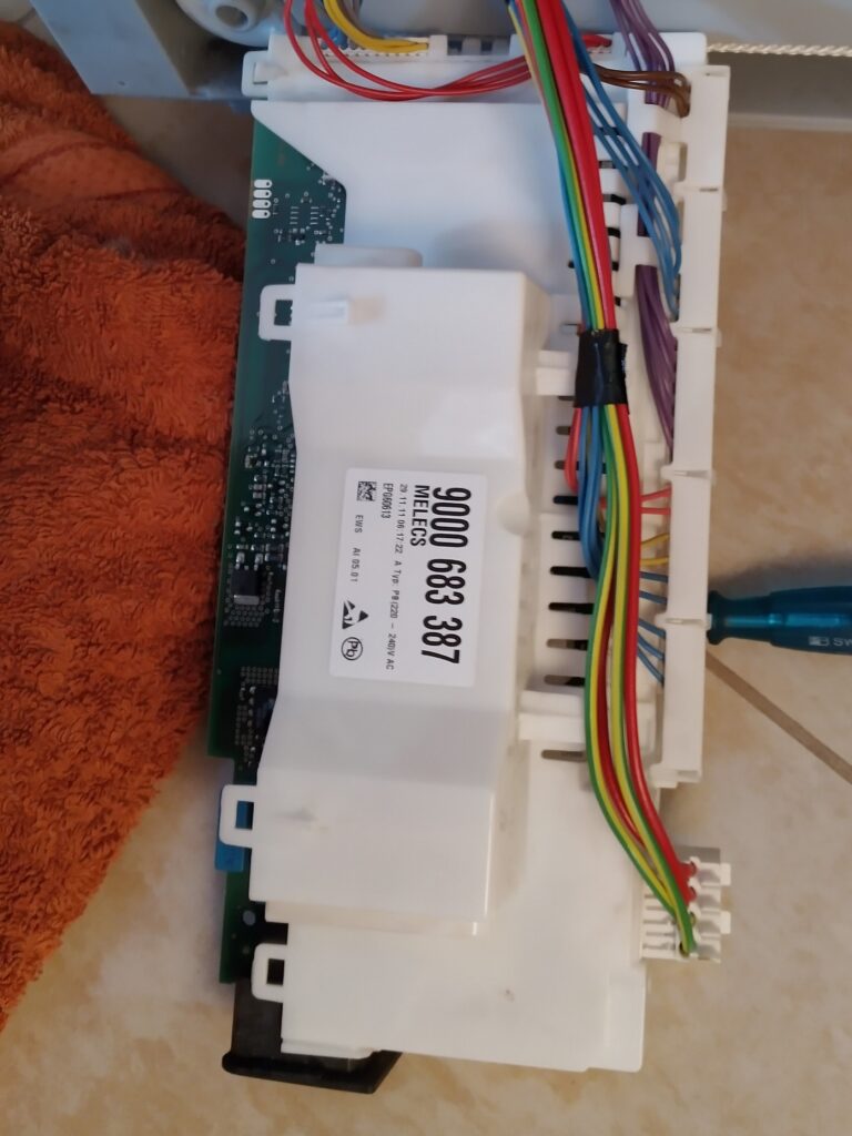 Before doing anything to it, I made sure to check if the circuit breaker hadn’t tripped and that there was power available on the power socket. This being the case and the machine appearing to be powerless, the first potential causes of failure which came to mind were maybe a bad contact in the power switch or maybe some internal protection which had tripped ( I knew from a previous repair that the machine has a float at the bottom to detect leaks.) or maybe some door contact malfunction.